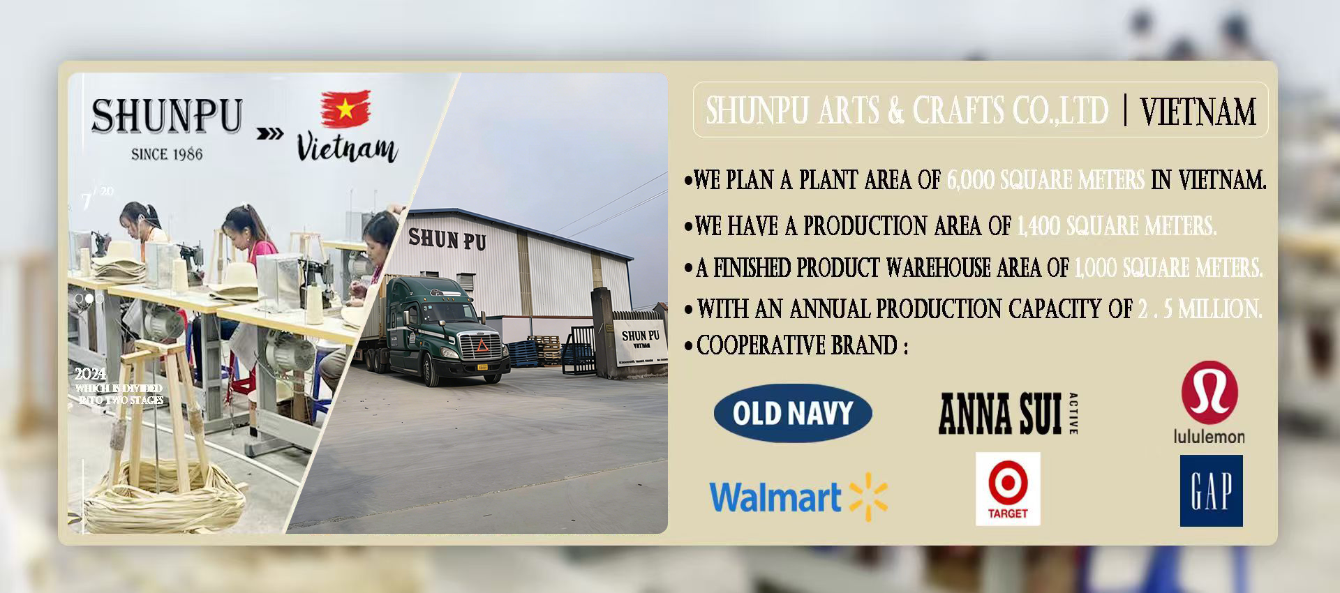 Shunpu Arts and Crafts Co., Ltd. We are a professional straw hat factory invested and built by China Zhejiang Shunpu Arts& Crafts Co., Ltd in Vietnam For this year the export tariff of straw hats add 25%, so in order to match customers of USA sourcing strategy, we moved straw hat production to Vietnam.